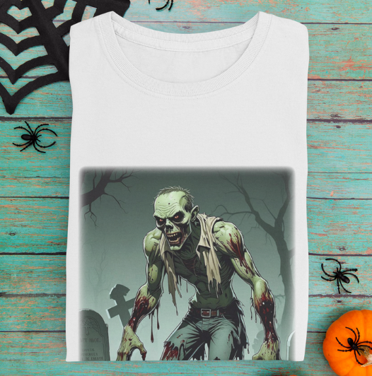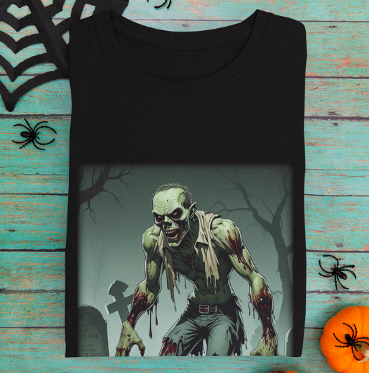Our exclusive Graveyard Nightmare Zombie T-Shirt is perfect for horror enthusiasts and those who love to make a bold, fearsome statement! This tee is ideal for Halloween or any day you want to unleash your inner zombie.